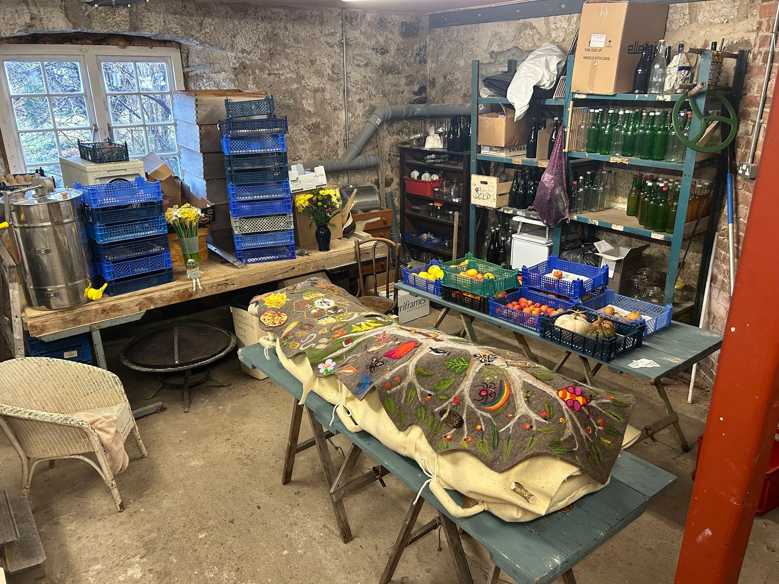 We wrapped Jill in her Leafcocoon (packed with ice) and she lay in her cellar surrounded by the fruits and products of her garden, and beekeping equipments. Friends visited daily to spend time with her in this gentle and loving space. She was buried in a natural burial ground in the village on February 1st, 2026.