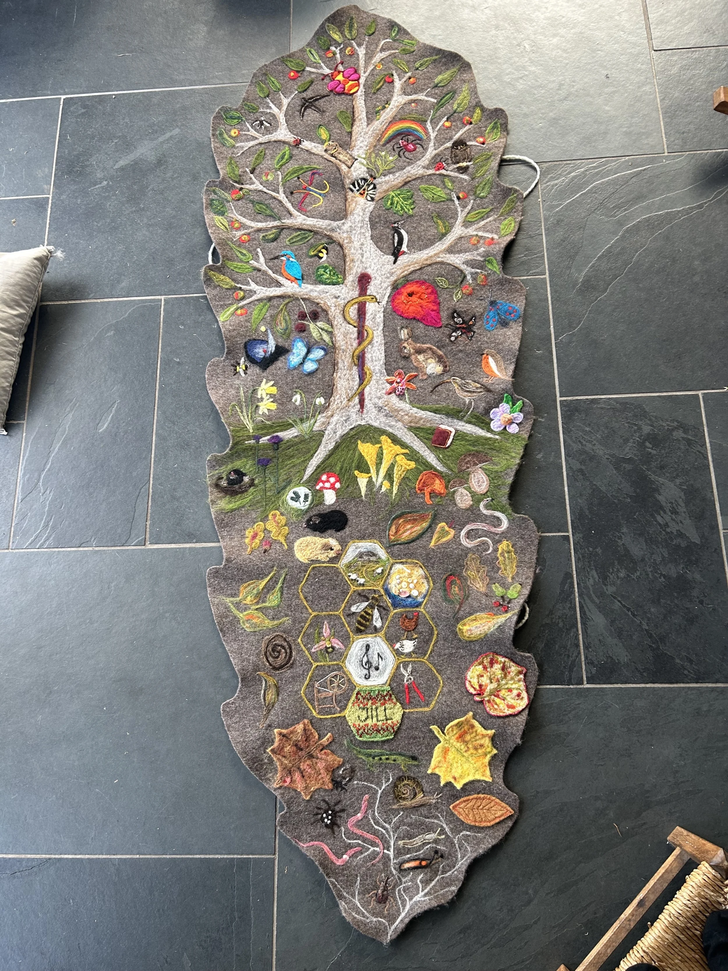 We have decorated the shroud with symbols that represent my life and what is important to me. The central motifs are a tree of life representing my family connections; the Aesculapius rod for my medical career; and honeycomb for my beekeeping. I invited friends and family to help - some embraced the opportunity immediately, while others were initially hesitant (but later became enthusiastic participants). I have lost count of how many people have helped; some people have sent material contributions from far and wide, and we have done collaborative sessions with half a dozen people felting at the same time.